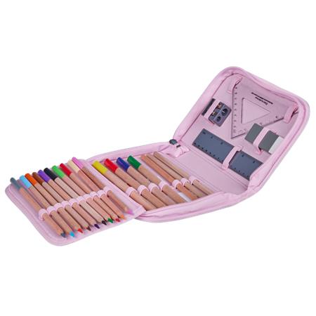 -feltöltött: 2 ceruza, 10 színes ceruza, 4 vastag színes ceruza, radír, hegyező, vonalzó és háromszöglető vonalzó